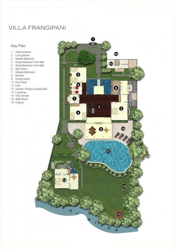 Villa Frangipani is a 4 bedroom rental villa, a peaceful rural sanctuary, nestled in the rolling green rice terraces near Canggu in Bali. Villa Frangipani is built on the side of a small valley, with a tranquil river at the foot of the garden. This charming traditional Balinese style rental villa is hidden away from Bali's worldly hustle and bustle, enveloped by tall trees and mature gardens to ensure total privacy.