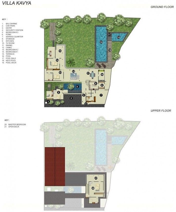 Villa Kavya features two pools with long wooden patios and lounges. Measuring 17m x 5m the main pool is large enough to allow you to swim laps. A smaller plunge pool of 6m x 4m, separated from the large pool by a small pavilion, is perfect for children.