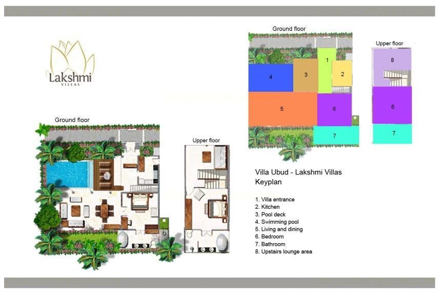 Villa Lakshmi Ubud is arranged in an L-shape around a swimming pool fed with two ornamental water fountains and set within a walled courtyard bordered with abundant tropical foliage. The kitchen, living room and TV lounge / second bedroom are on the ground floor, with the master bedroom and a breezy sunset terrace on the upper floor.