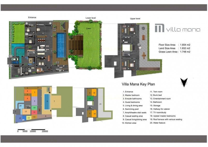 The entrance to Villa Mana bridges a wading pool fed by a wall of cascading water, and opens into a massive T-shaped living area that flows through the centre of the villa, then spreads across its full width and wraps around the swimming pool in front.
