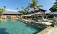 Entered through an ornate doorway and stepping stones over a fishpond, the ground floor of 6 bedroom Seseh Beach Villa II’s symmetrical main building presents a spacious ...
